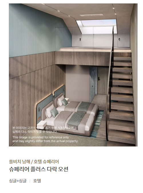 - 오션뷰 디럭스 — 34 ㎡ / 더블+싱글 / 5-9층 : 침대에 누워 일몰 직관, 유리 난간 발코니 인생샷 필수.