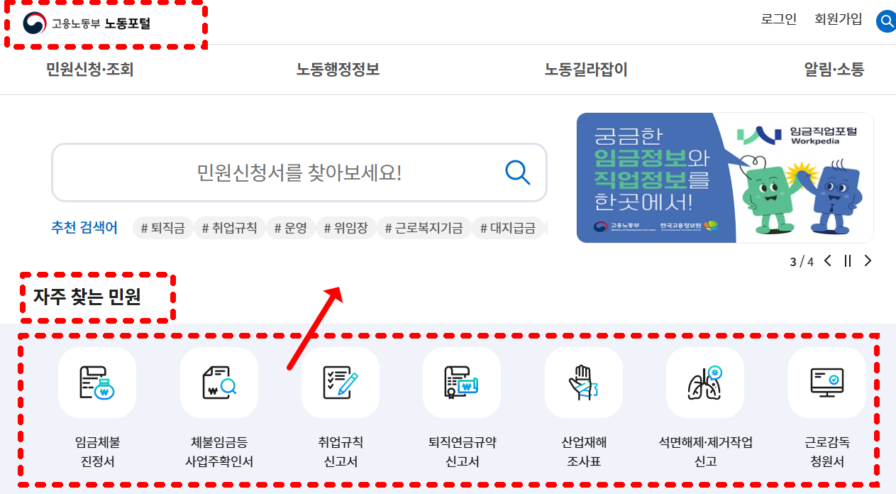 ① 고용노동부 민원센터 접수: 온라인 또는 오프라인 접수 가능