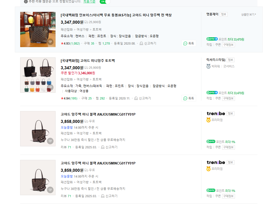 ④ 고야드 미니 앙주 블랙/탄 (백화점 보증서 포함): 3,347,000원 (병행)
