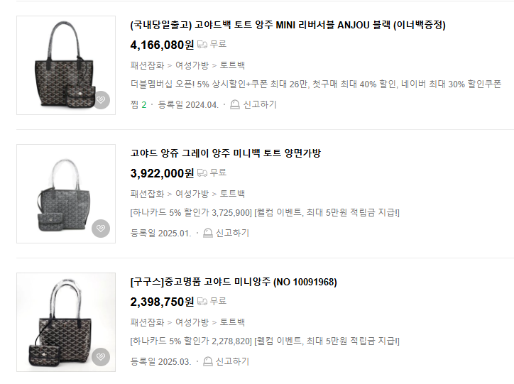 2️⃣ 고야드 미니 앙주 2025년 최신 가격 비교 (한국 vs 해외)