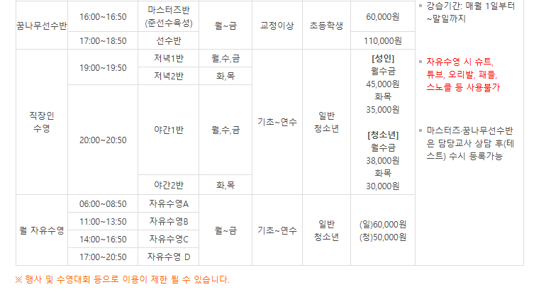 💡 수영강습은 월 단위로 운영되며, 매월 1일부터 말일까지 강습이 진행됩니다.