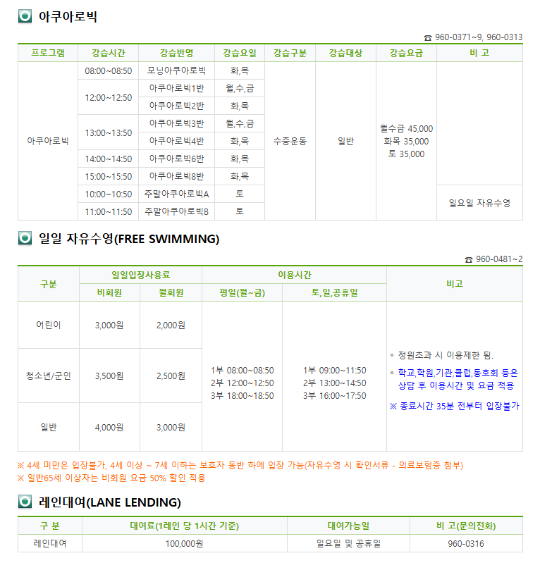 - 📆 정기 프로그램 외에도 자유수영, 아쿠아로빅 등 다양하게 구성
