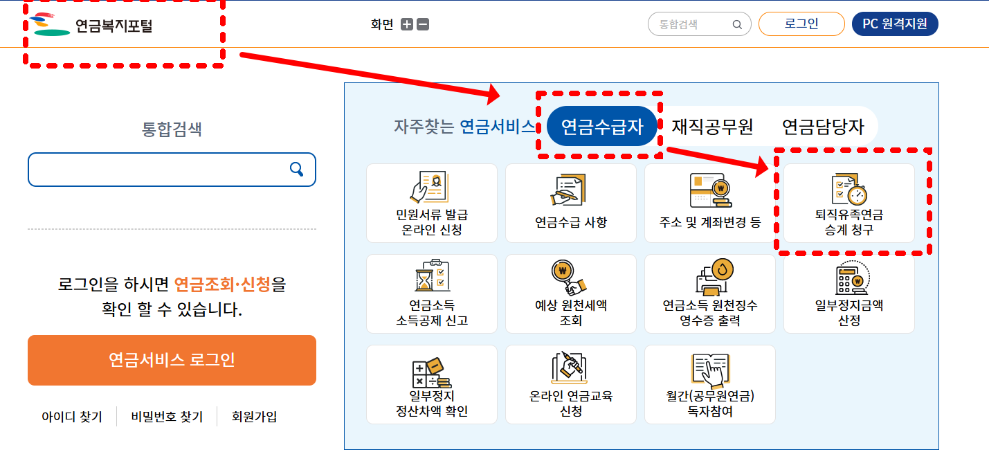 ③ 경로: 연금서비스 → 연금수급자 정보 → 퇴직유족연금 승계 청구