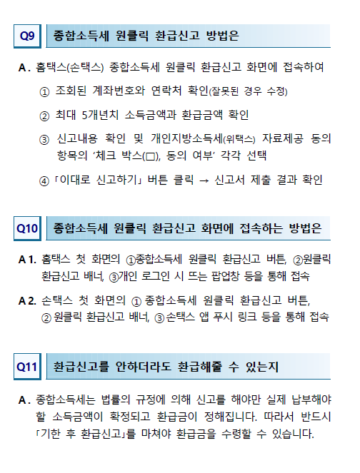 - 신청 방법: 홈택스(www.hometax.go.kr) 접속 후 '원클릭 환급 신고' 버튼 클릭