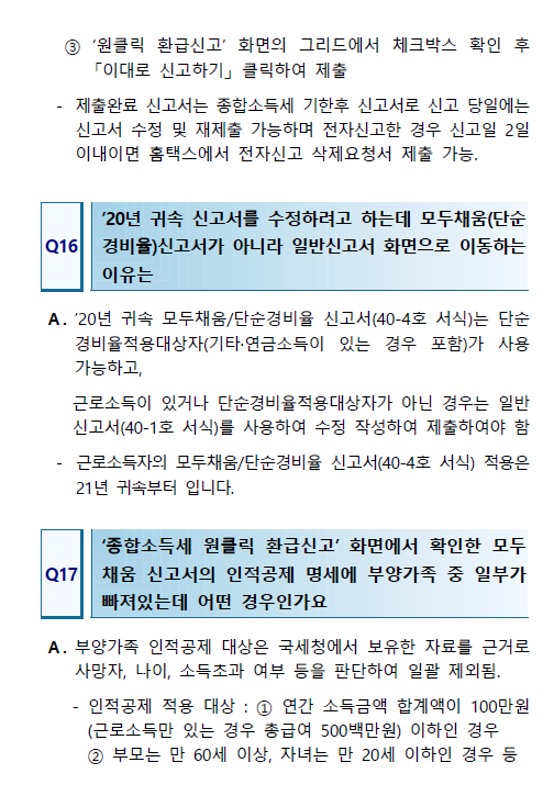 • 부당공제에 주의하세요! 국세청이 지난 몇 년간 급증한 환급 신청을 고액 환급자들을 중심으로 우선 검토한 결과, 과다 환급 신청으로 가산세가 부과되는 사례를 다수 확인하였습니다.