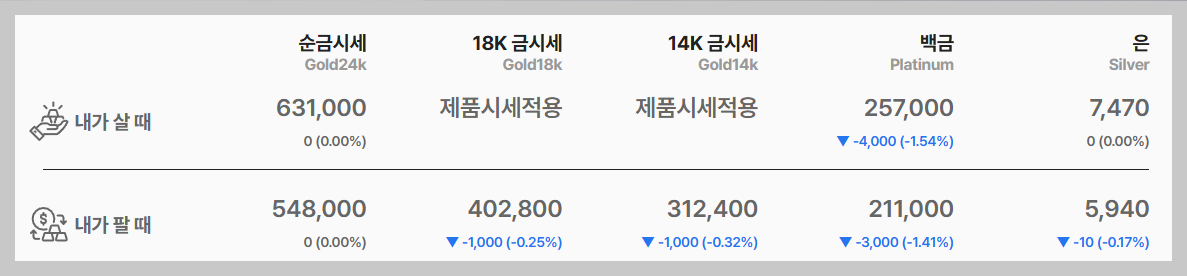 - 순금(24K) 살 때: 631,000원 / 3.75g(돈 단위)