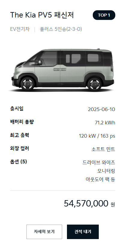 - PV5 7인승(크루): 가족용, 출퇴근용, 승합 스타일