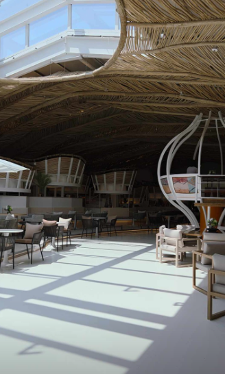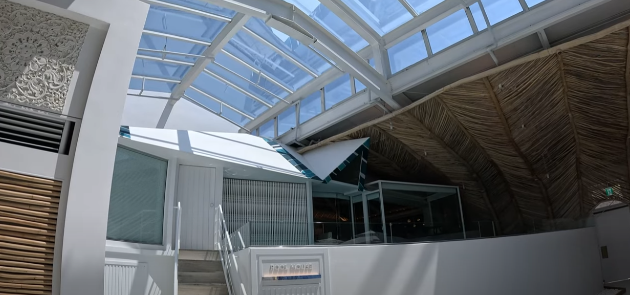 - 발리 리조트 라운지 – 천장 10 m 유리 돔 + 대형 야자수