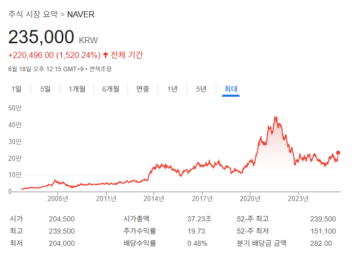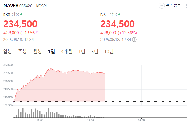 6월 18일 오전, NAVER(035420)의 주가는 전 거래일 대비 12.11% 오른 231,500원에 거래되며 시장의 주목을 받았습니다.