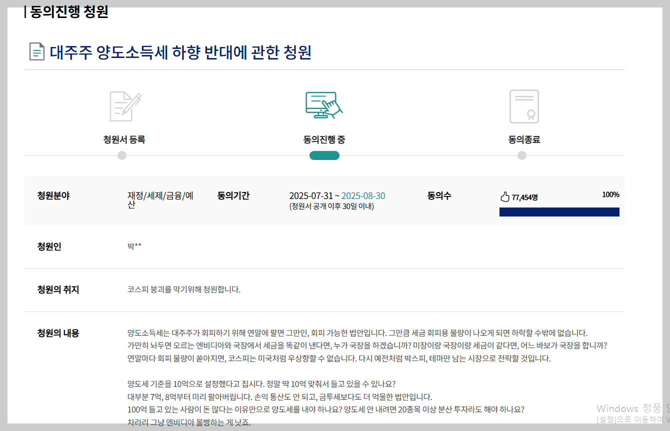 현재 ‘대주주 양도소득세 하향 반대’ 청원이 국회 국민동의청원 사이트에서 진행 중입니다.