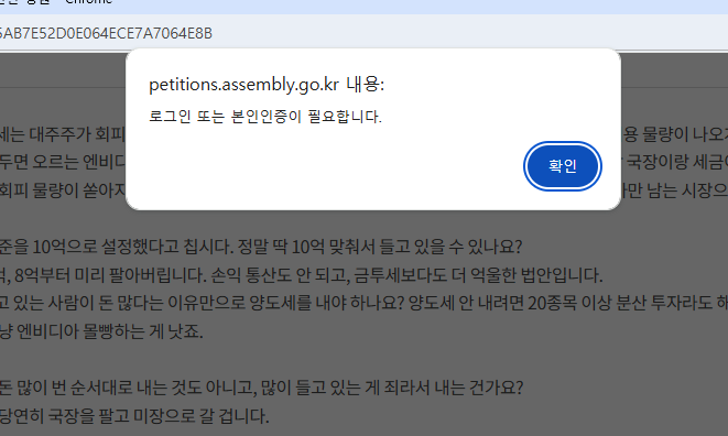 - 대주주 양도소득세 하향 반대에 관한 청원 항목에서 [동의하기] 버튼 클릭