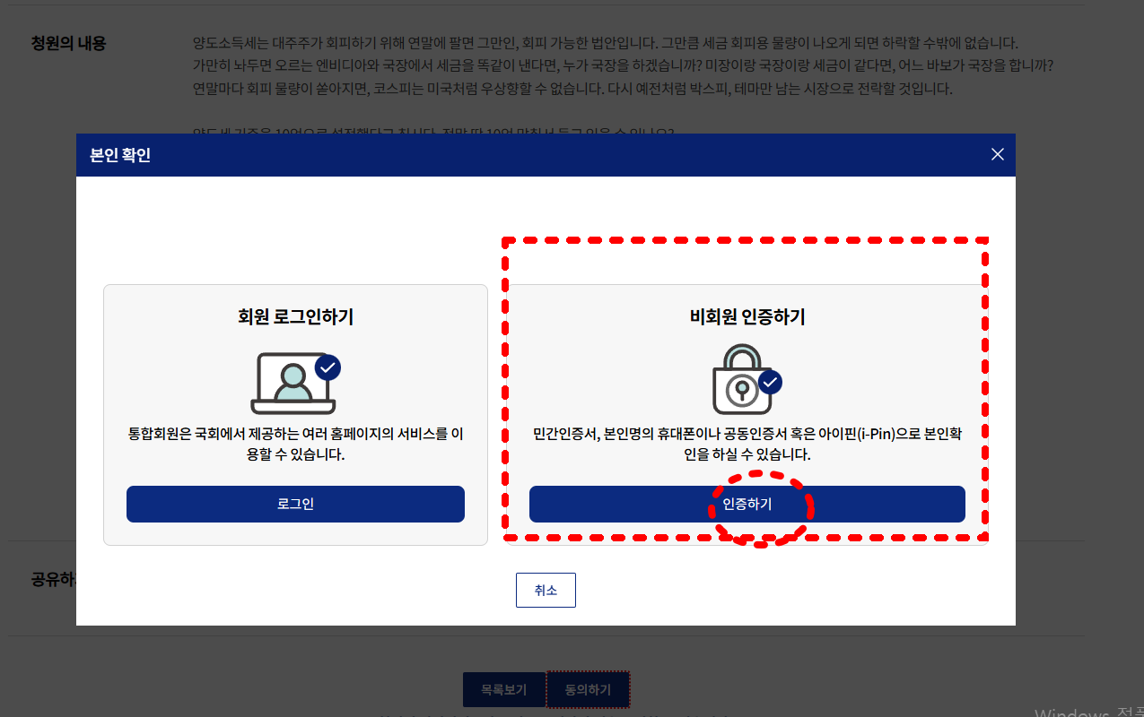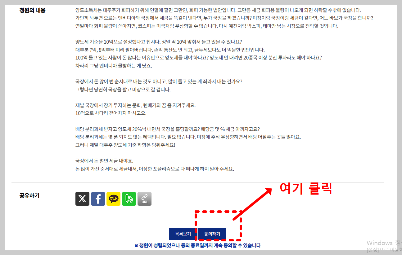 6. 대주주 양도소득세 하향 반대 국민청원 동의 방법 (사진 설명 포함)