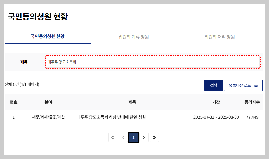 현재 ‘대주주 양도소득세 하향 반대’ 청원이 국회 국민동의청원 사이트에서 진행 중입니다.