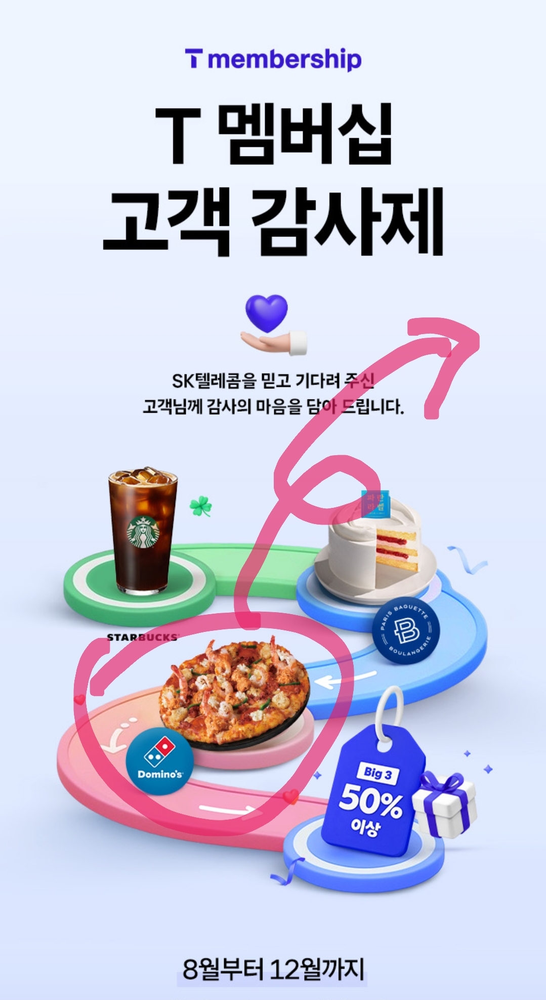 8월 SKT 고객 감사제로 도미노피자 배달 50% · 포장 60% 할인! T멤버십 앱에서 쿠폰을 받아 도미노 홈페이지/앱에 입력하면 됩니다. 기간, 최대할인, 제외메뉴·미진행 매장, 주문 절차까지 한 번에 정리했습니다.