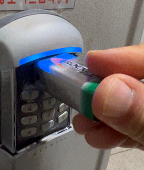 전원이 공급되면 도어락의 키패드에 불이 들어오고, 평소처럼 비밀번호를 입력하여 문을 열 수 있습니다.
