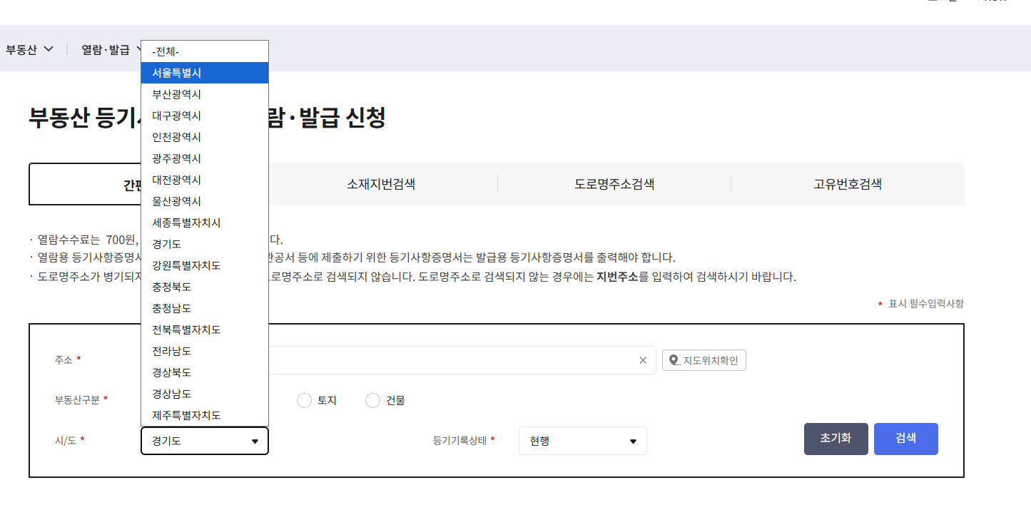 TIP: 집합건물인지 토지인지 명확하지 않을 경우 '전체' 선택 후 검색 권장