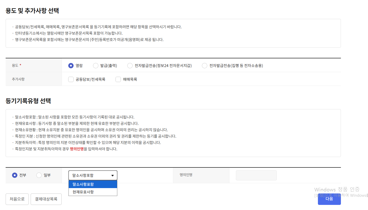 4. 등기기록유형 선택 (말소사항 포함 or 현재유효사항)