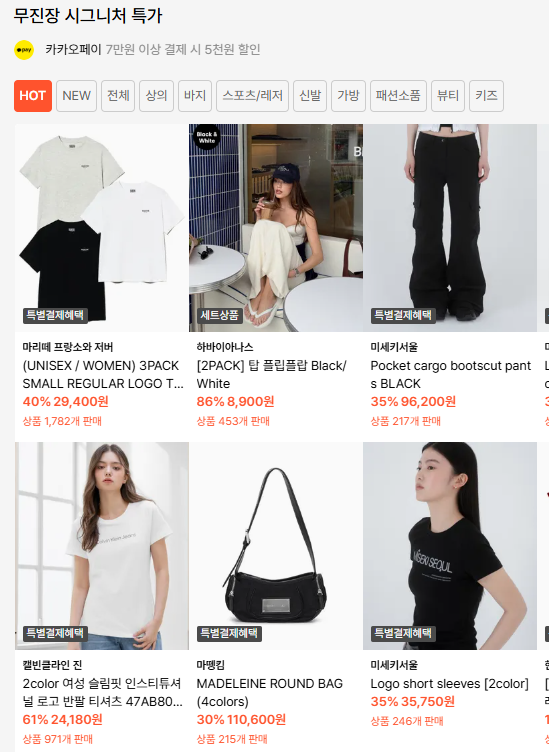 - 인기 상품: 스탠다드 티셔츠/팬츠, 나이키 조던, 캐주얼 재킷, 스니커즈