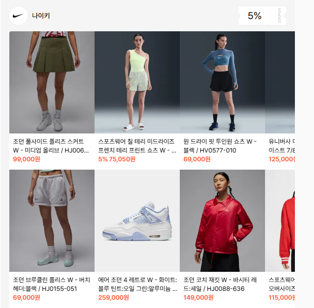 - 인기 상품: 스탠다드 티셔츠/팬츠, 나이키 조던, 캐주얼 재킷, 스니커즈