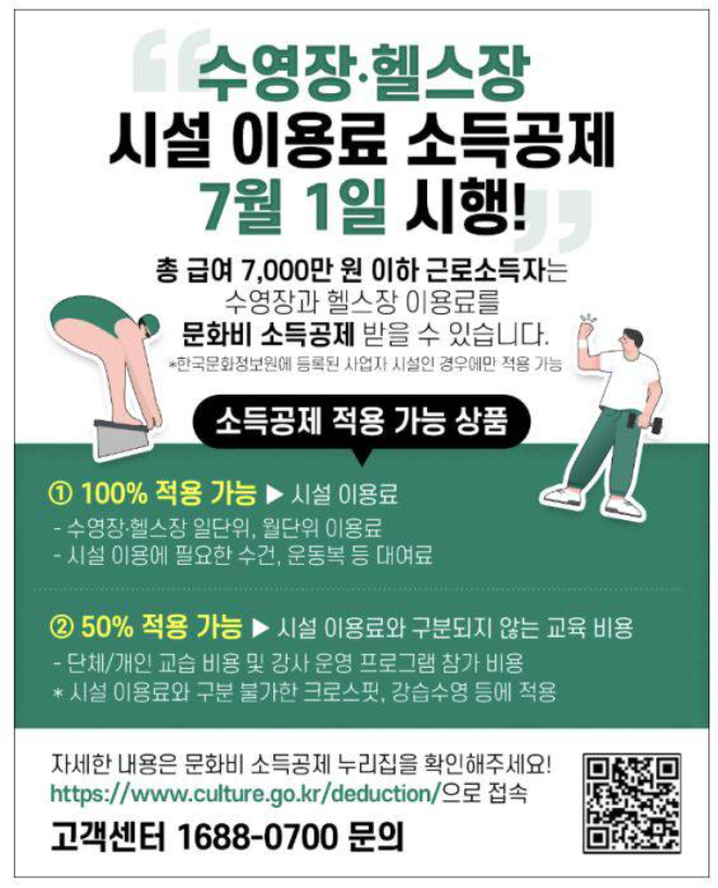 수영장, 체력단련장, 공공체육시설 포함 2025년 7월부터 공제 대상에 수영장, 체력단련장, 공공 체육시설 등이 추가됩니다.