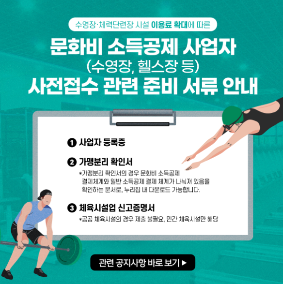 종합체육시설업 포함된 이유 기존에는 제외됐던 종합체육시설업도 현장 요구에 따라 공제 대상에 포함되었습니다. 단, 수영장 또는 헬스장이 없는 시설은 제외됩니다.