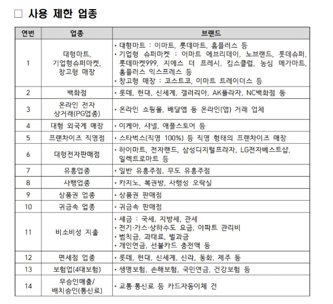 사용 불가 업종은 아래에 별도 정리