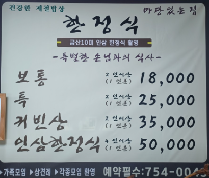 ② 인삼한정식은 18,000원부터 50,000원까지 구성별로 선택 가능해서 예산이나 목적에 따라 골라 드시기 좋아요
