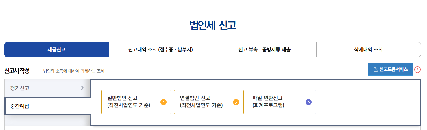 - 홈택스 로그인 → 법인 → 법인세 → “법인세 중간예납 신고” 선택