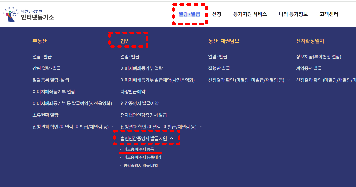 - [열람·발급] → [법인] → 법인인감증명서 발급지원