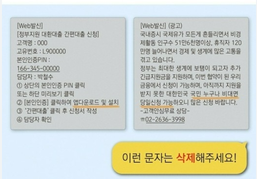 → 대부분의 경우 피해는 없지만, 스미싱 탐지 앱 설치 & 휴대폰 정밀 점검 권장