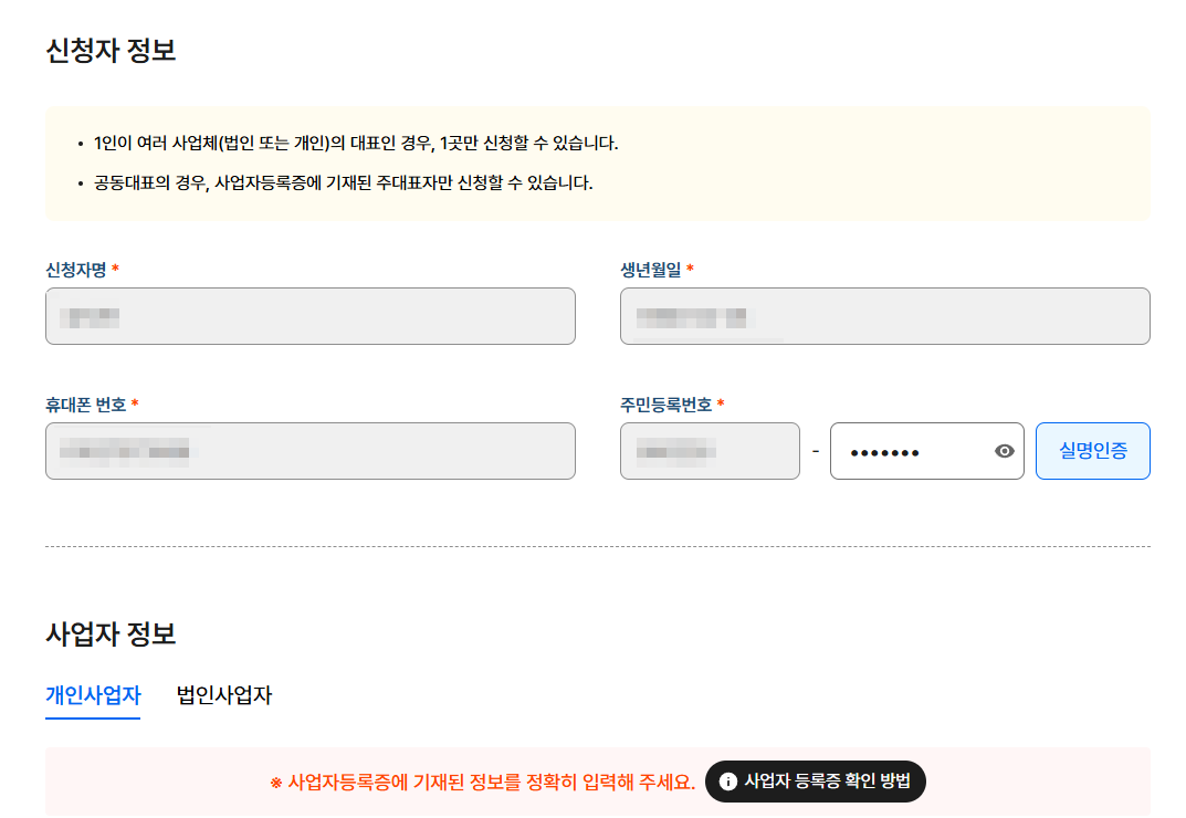 - 다수 사업자 보유자는 1곳만 신청 가능 (중복 신청 제한)