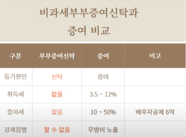 최근에는 취득세·증여세 없이 부부간 명의변경이 가능한 방법으로 ‘비과세 부부 증여신탁’도 각광받고 있습니다.