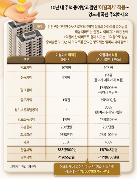 단, 증여 시점부터 10년 이내에 처분할 경우 ‘이월과세’ 규정이 적용될 수 있으므로 주의해야 합니다.