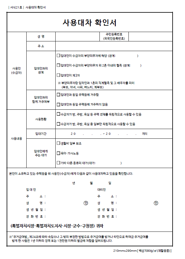 필수정보 | 거주자·소유자 성명, 주소, 사용기간, 서명 |