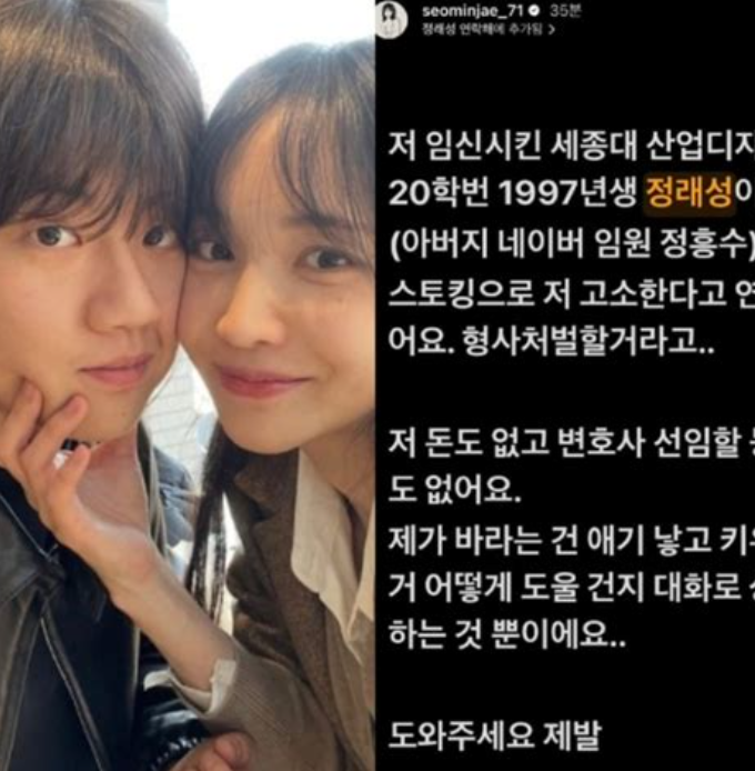 서민재는 남자친구와의 갈등이 심화되자 그의 아버지의 실명과 직장까지 공개했습니다. 그녀는 SNS를 통해 정래성 씨의 아버지가 대기업에서 고위직에 있었다는 내용의 기사 캡처를 올리며, "저 돈도 없고 변호사 선임할 능력도 없다. 제가 바라는 건 아기 낳고 키우는 거 어떻게 도울 건지 대화로 상의하자는 것뿐이다. 제발 도와 달라"라고 호소했습니다.