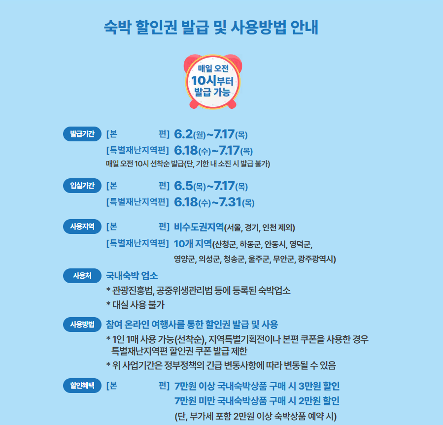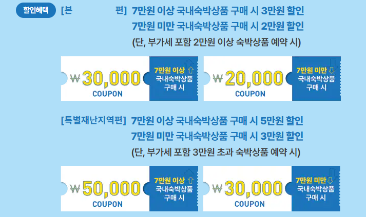 - 2025년 6/2~7/17, 비수도권 숙박 최대 3만 원, 특별재난지역 최대 5만 원 쿠폰