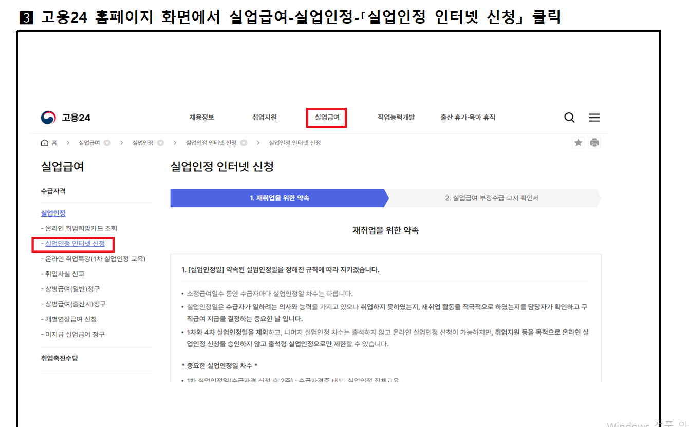 고용24 실업급여에서 실업급여 → 실업인정 → 실업인정 인터넷신청 메뉴로 접속합니다