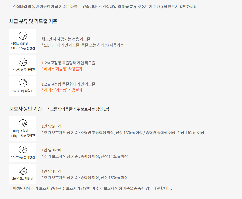 - 동반 기준 : 2 년 이내 종합백신·광견병 접종 완료 소형·중형견(≤15 kg) 1마리 + 추가 1마리(30,000 원) 가능