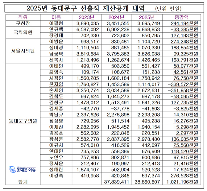 | 합계 | 68억 6,885만 원 | –0.5% | 동대문구 선출직 1위 |