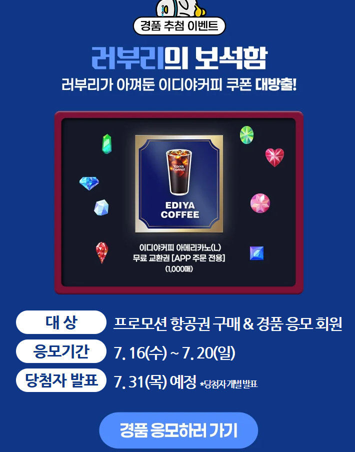 특가 항공권 구매자 중 이벤트 응모 회원을 대상으로, 에어부산은 이디야커피 아메리카노(L) 쿠폰도 제공합니다.