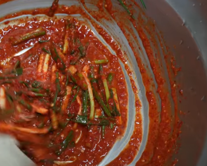 • 찹쌀풀 끓여서 식힌 뒤 양념과 고춧가루, 액젓 섞어 양념장 만들기