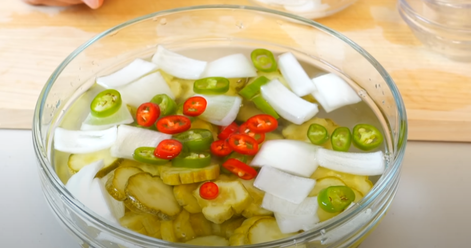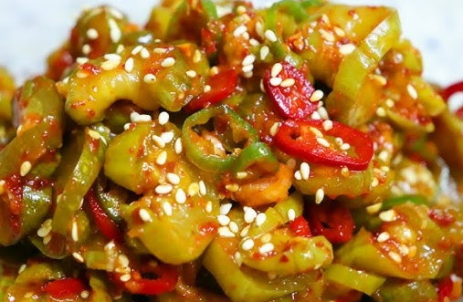 - 썰은 오이지 + 햇양파 + 청양고추 + 홍고추