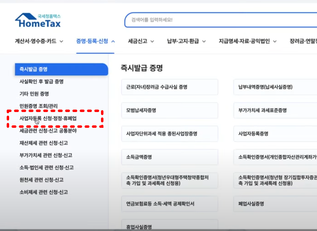 ▶ 신청 경로: 홈택스 바로가기 > 민원증명 > 사업자등록 정정신고