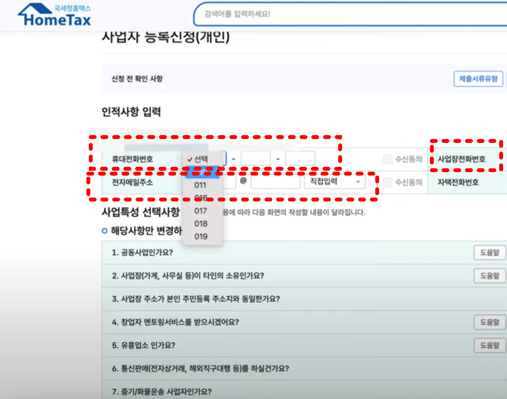 - 인적사항 및 업종, 사업장 주소, 세금계산서 수신 이메일 등 입력