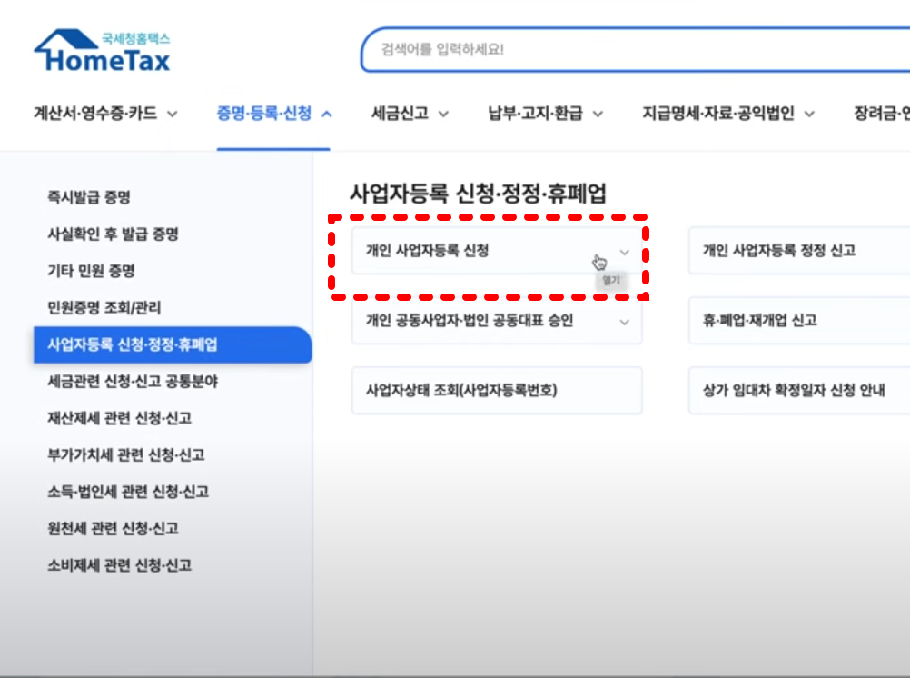 - 홈택스 접속 후 "민원증명 > 사업자등록 신청" 클릭