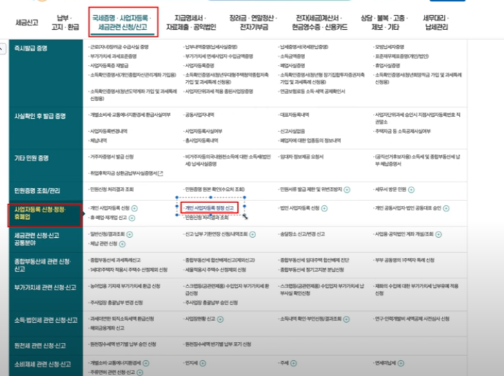 - 업종/주소 변경: 민원증명 > 사업자등록 정정신고 메뉴 이용