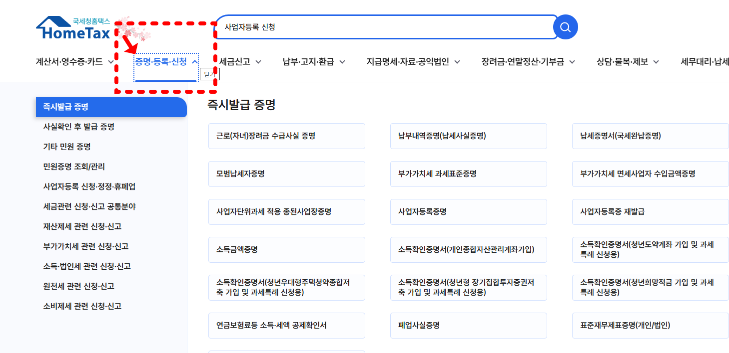 - 홈택스 접속 후 "민원증명 > 사업자등록 신청" 클릭