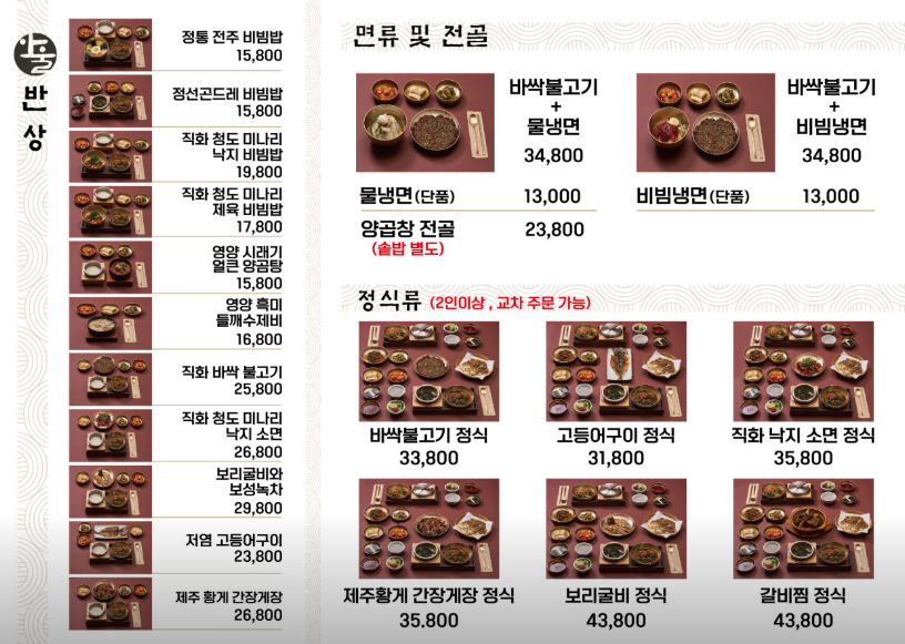 - 추천메뉴: 직화불고기 정식, 제육비빔밥, 누룽지