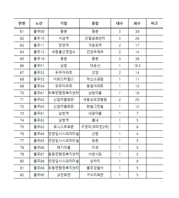 • 시청 교통과 공문 기준 “105개 노선 전체 목록은 [울산시 교통/새소식] 게시판 첨부파일(운행노선.hwp) 참조”