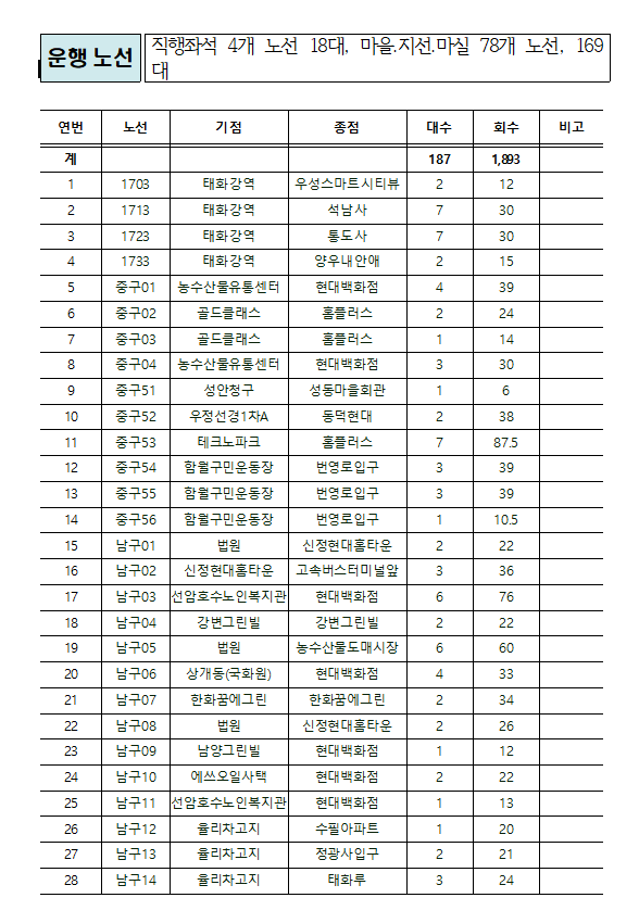 • 정상 운행 : 직행좌석 4개 노선 + 지선·마을·마실 78개 노선.